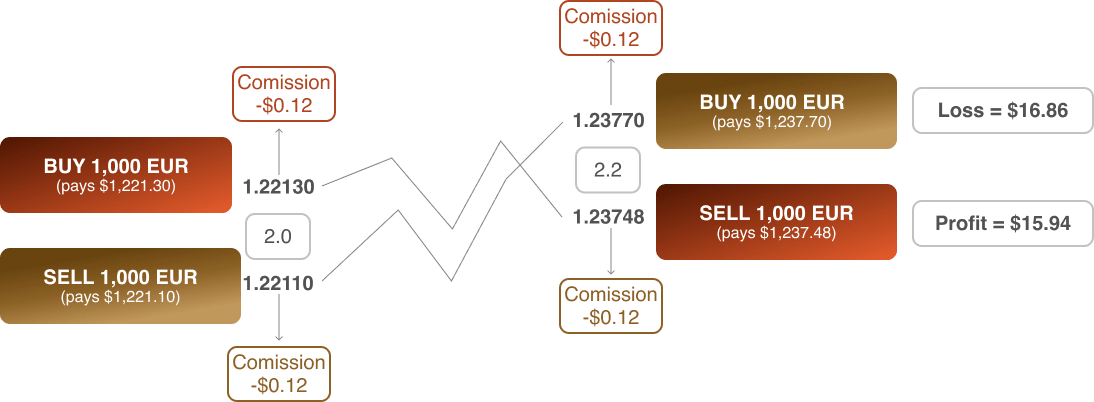 Commissions are charged when you open and close a trade. In this example, the commission charged is €10 per Lot. Once adjusted according to the trade size of 0.01 Lots the commission becomes €0.10. When converted to dollars, it becomes $0.12.